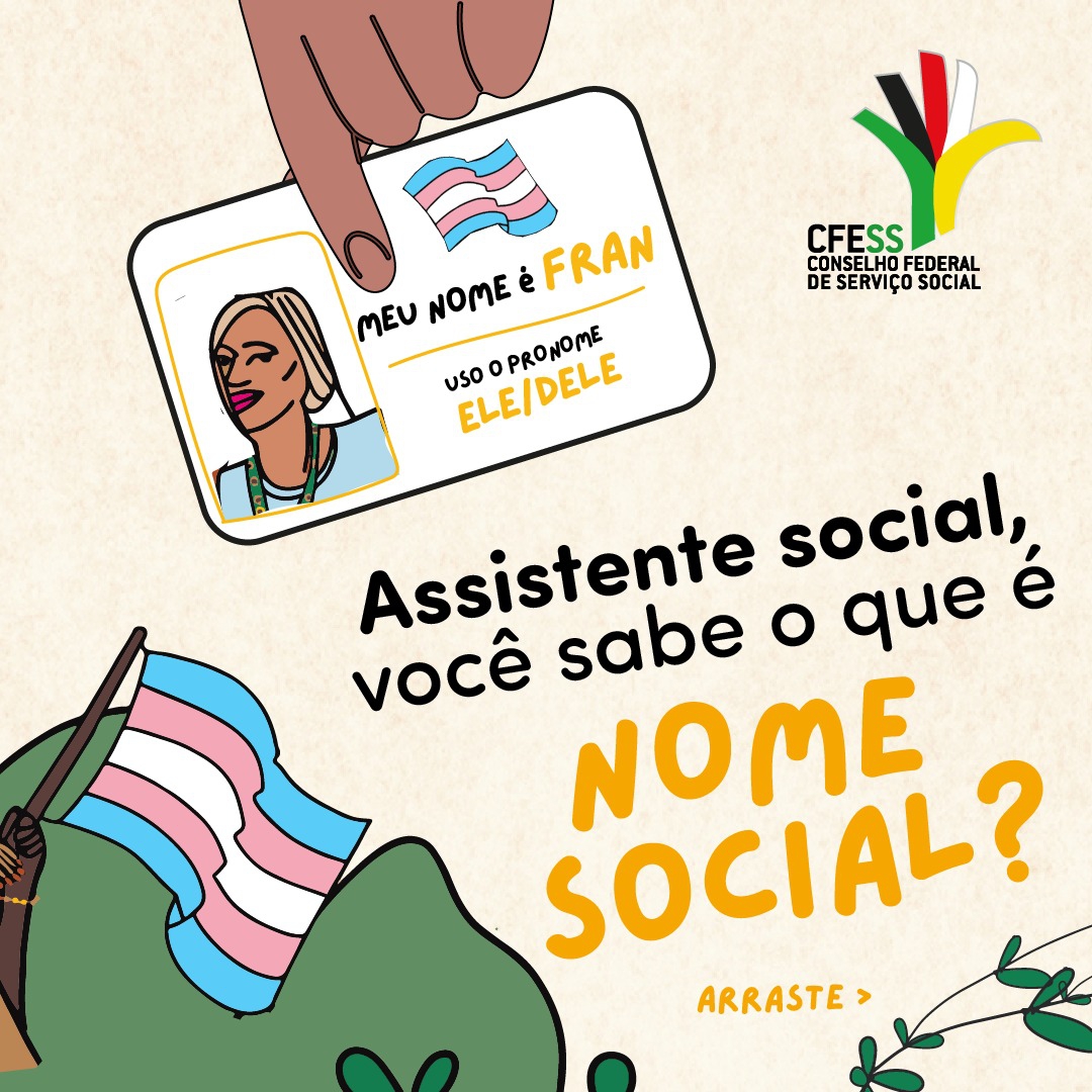 O Conjunto CFESS-CRESS compreende que o uso do nome social é direito: assistentes sociais devem respeitar o nome social de pessoas usuárias dos serviços e ter seu uso respeitado nos espaços sócio-ocupacionais. É importante destacar que travestis e transexuais, por vezes, também se autoidentificam como pessoas trans ou transgêneros. Existem diversas discussões a respeito das terminologias, que são mais amplas, envolvendo diferentes formas de expressão/identidade de gênero. São essas pessoas que utilizam o nome social para informar à sociedade o nome que as identifica em suas relações pessoais e sociais, adequado à sua expressão/identidade de gênero.